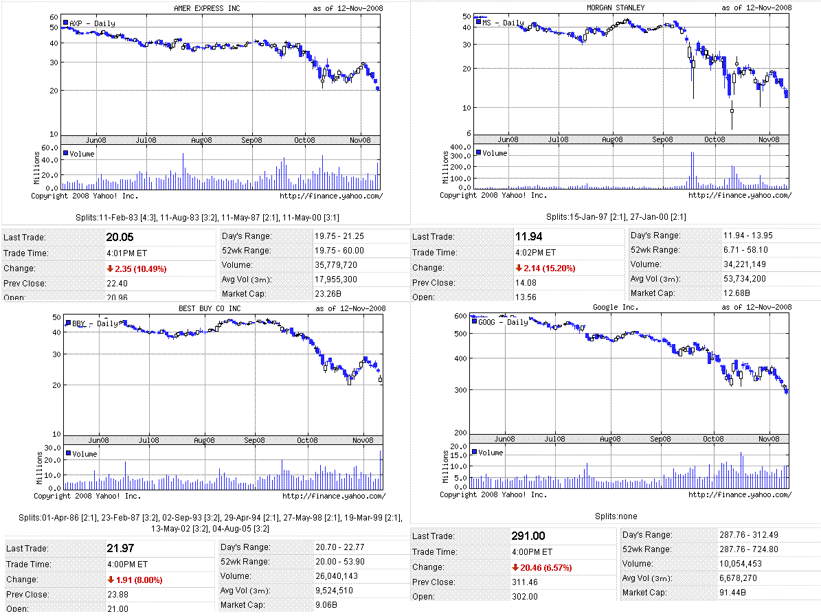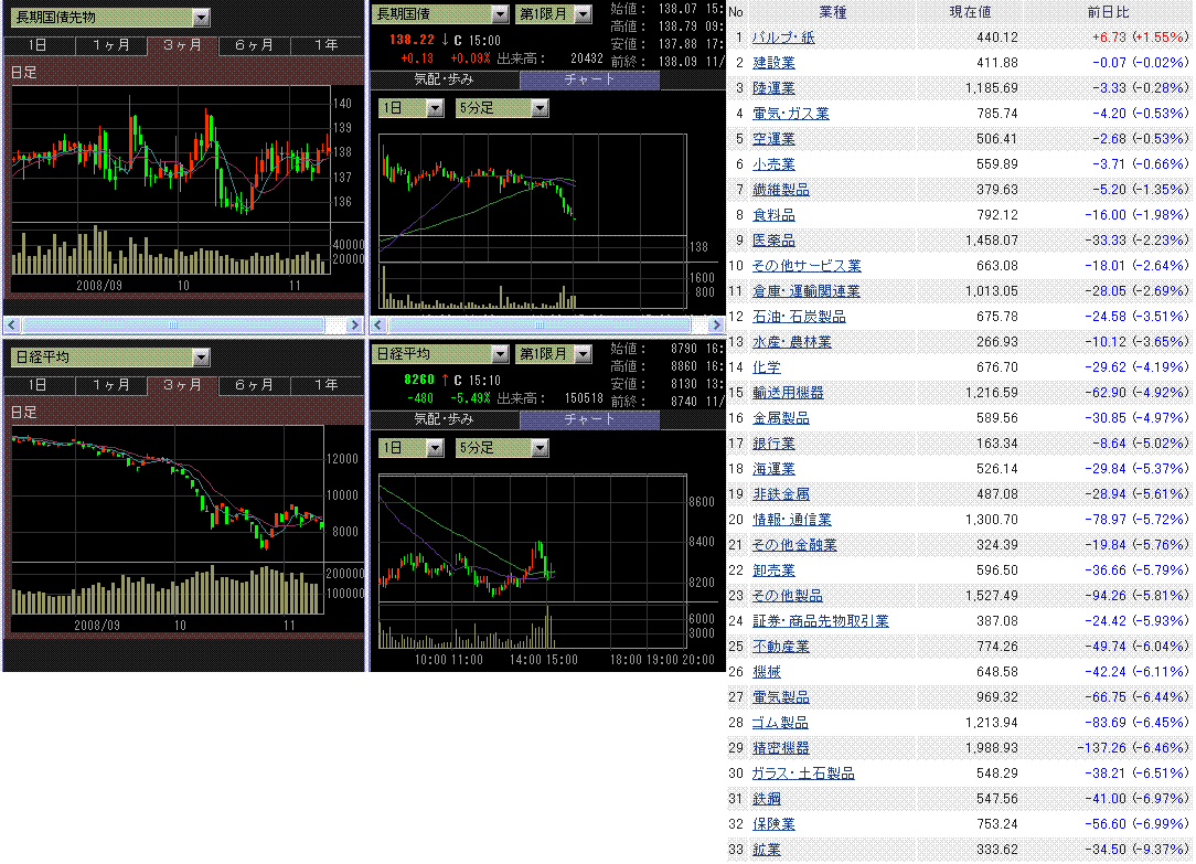 小売り大手の厳しい売上見通しやモルガンスタンレーのリストラ計画から、景気悪化の懸念が強まり米株は大幅続落しました。ポールソン米財務長官が、TARPの適用方法について、当初の目的である不良資産の買い取りは行わず、直接資本注入を行うことを示唆したことも不安感を煽ったようです(コロコロと言動を変えると後手に回っている印象になり信頼感が無くなる)。原油価格は続落。WTI 55ドルを割れました。