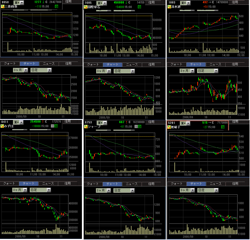 東証一部出来高は22億株、売買代金は1.7兆円と、大幅安の日の割に出来高が増えませんでした。先行き不透明感から様子見の投資家が多いのでしょう。業種別では、ディフェンシブ以外は全体的に大幅下落でした。原油安で資源関連が特に弱かったです。三菱UFJ証券が清水建設のレーティングを引き上げたことから、大手ゼネコン株が強かったです。ソフトバンクは昨日ストップ高で今日はストップ安と極端な動きでした。