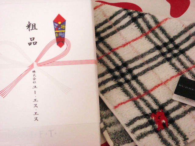 頂きました。家で開けてみるとバーバリーのミニハンドタオルなのでビックリしました。