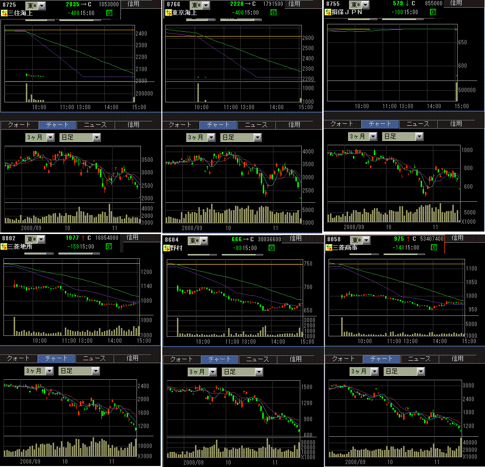 米株安と円高進行を受けて日経平均は大幅続落。今日の日経平均の下落率は歴代11位となりました。業種別では昨日の引け後に決算を発表した各保険会社が大きく売られました。三井住友海上、東京海上、損保ジャパンなどストップ安だらけです。不動産、証券会社、商社なども大幅下落でした。米国債高で、債券先物買い・株先物売りが入った感じで、これも株価の下げにつながりました。東証一部出来高は21億株、売買代金は1.6兆円。昨日より少しは増えましたが相変わらず低水準です。