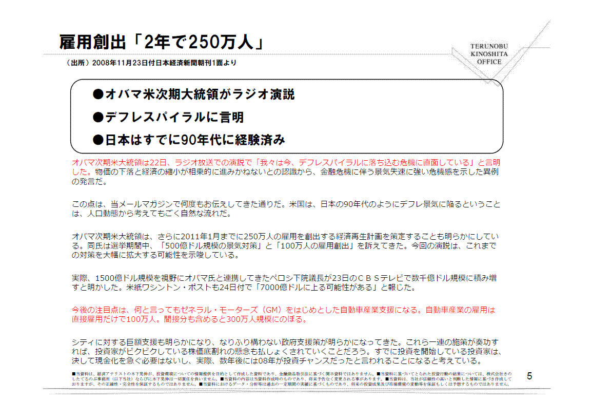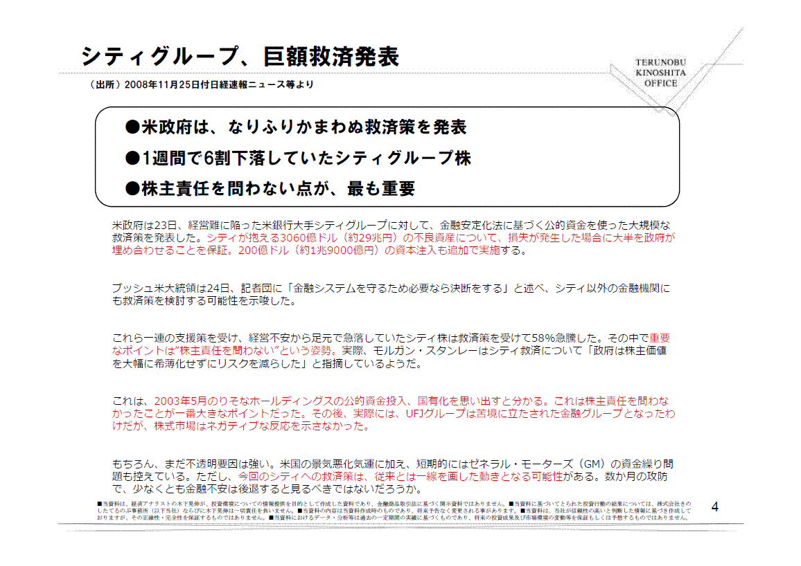 >GMのような問題は、株式相場の上昇局面で起きる話ではなく、株式相場の大底で起きやすい。GM問題は、それが語られている最中に株式相場は織り込んでおり、救済か破綻処理か決まってから、反応する話ではないと考えている。