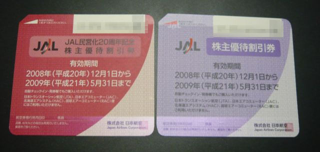 のJAL、JEXが運航する国内線全路線対象で1枚につき片道運賃が50%引きになる優待券がもらえます。