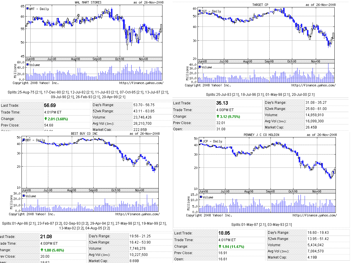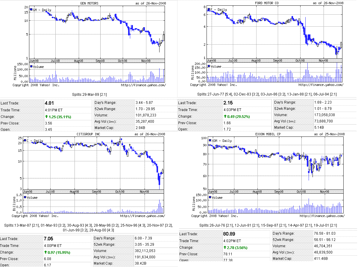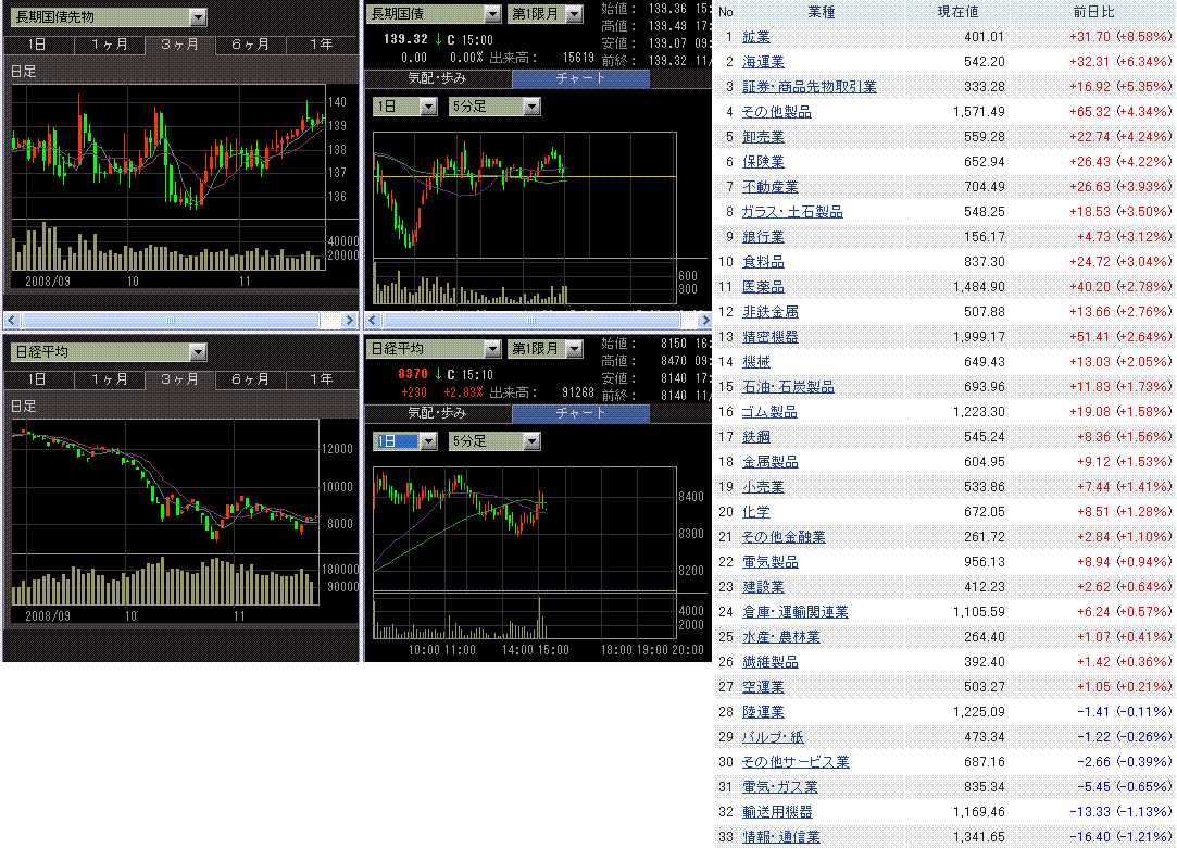 米株は大幅高。ダウとS&P500は4月以来の4連騰となりました。この日発表された経済指標はいずれも暗い数字だったのですが、木曜はThanksgiving Dayで休場、金曜は半日立ち会いってことで、ショートの買い戻しが入ったのかもしれません。相場は各国の金融対策、景気対策を消化しつつ、徐々に落ち着いてきている感じですね。GM、フォード株が大幅高となったことも全体相場のプラスとなったようです。あと、解約期限を過ぎたことでファンド勢の換金売りがだいたい止まって、売り圧力が小さいのだと思います。全体の出来高も少なかったです。VIX指数は55まで低下しました。