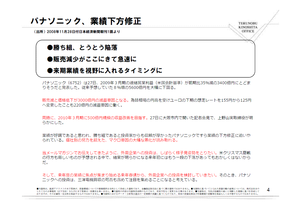 本日は、パナソニックの修正から、消費を切り口にお届けしています。