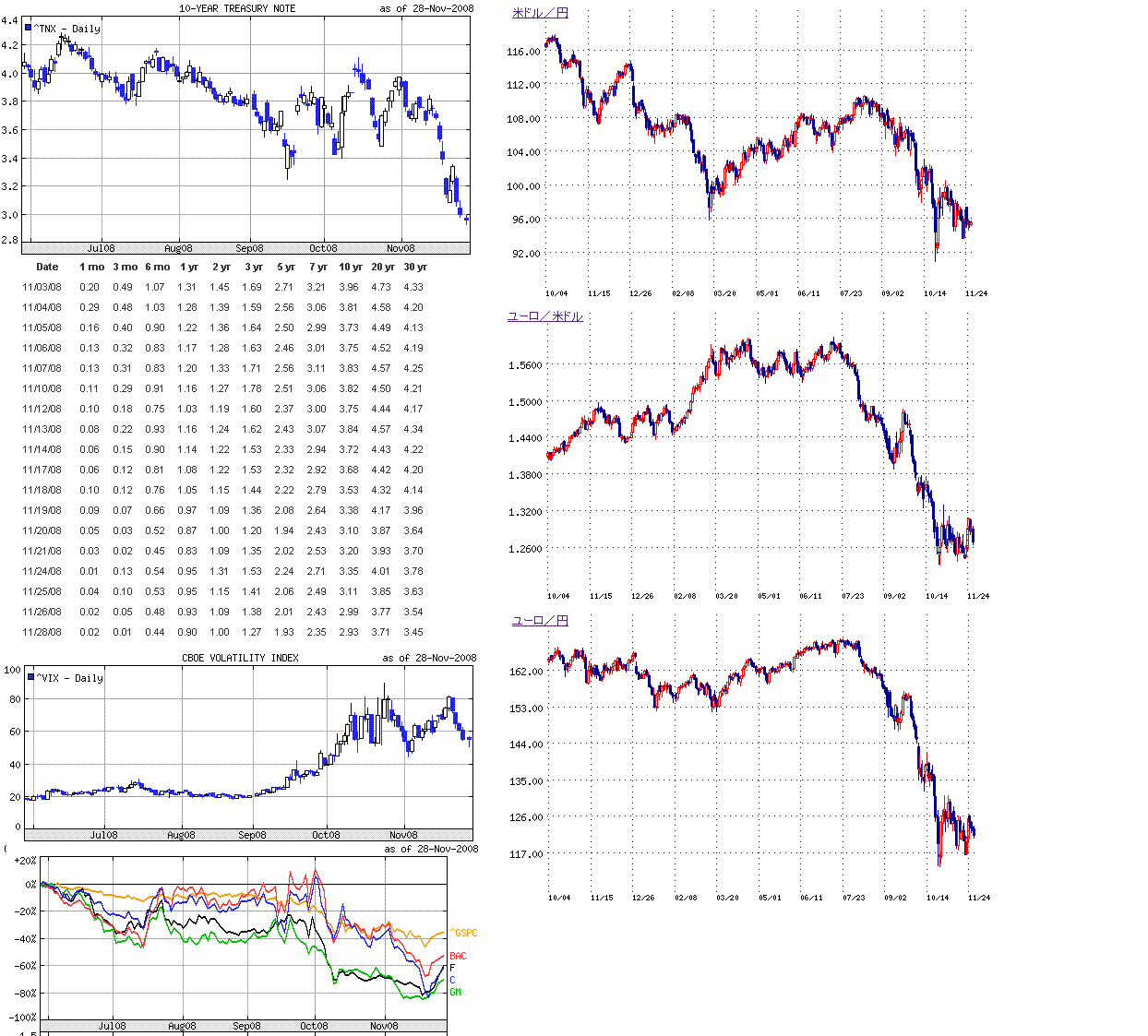 米国債は、短期も長期も利回りの低下が著しいです。1か月、3か月ものはほぼ0%。10年債はとうとう3%割れ。短期国債の水準は、株式市場などの状況を見ると10月頃のパニック的な質への逃避とは違う感じなのですが、ゼロ金利を織り込みにいっているのでしょうか。長期国債は、不景気の長期化やデフレ懸念でしょうね。