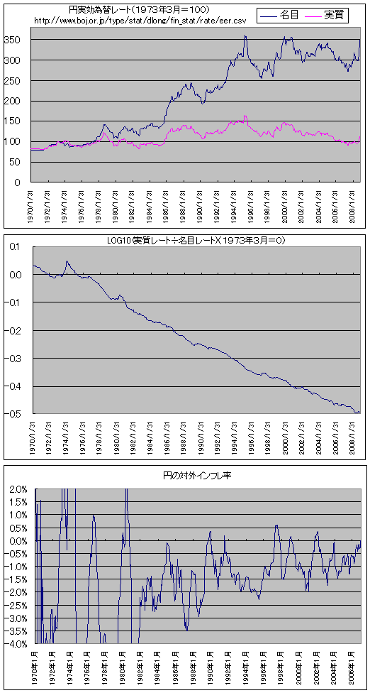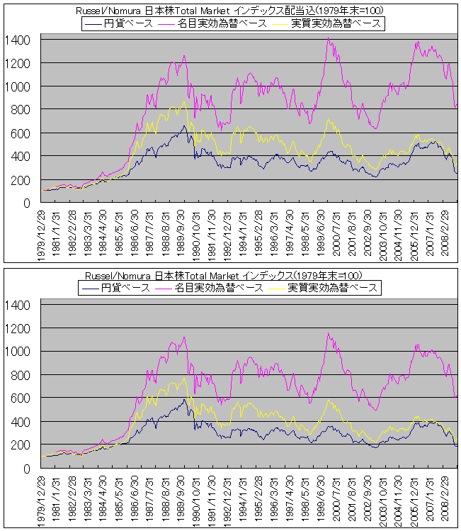 実効為替レートとRussel/Nomura 日本株インデックスの推移です。
