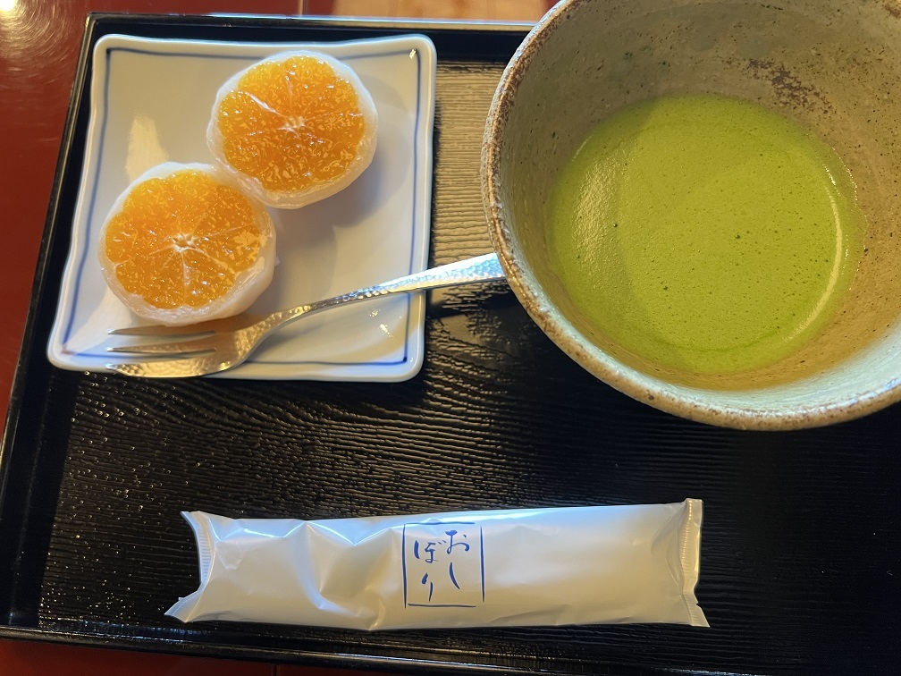 良い部屋で、大福にミカンをいれたもの。