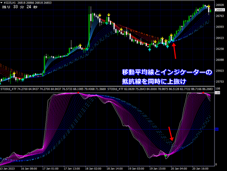移動平均線だけでなく、インジケーターの曲線帯にも