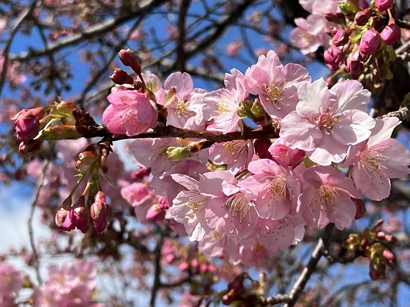 暑い一日で、岡崎の乙川河畔の河津桜を見に行った。