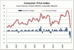 米労働省が16日発表した11月の消費者物価指数(1982-84年の平均値=100)は季節調整済みの前月比の変動率で1.7%下落した。市場予測の平均(マイナス1.3%)も下回り、過去最大の下落幅(1.0%)だった10月をさらに大幅に下回った。景気失速に信用収縮が加わり需要が減退。デフレの懸念が高まっている。 エネルギー価格が17.0%、航空運賃などの輸送サービス価格が9.8%それぞれ下落した。変動の大きいエネルギーと食品を除いたコア指数は横ばい。前年同月比では全体が1.1%上昇、コア指数は2.0%の上昇にとどまった。