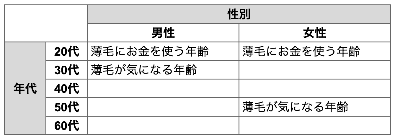 薄毛ユーザーは以下の図の様に、年齢軸と性別軸で分類する事ができます。