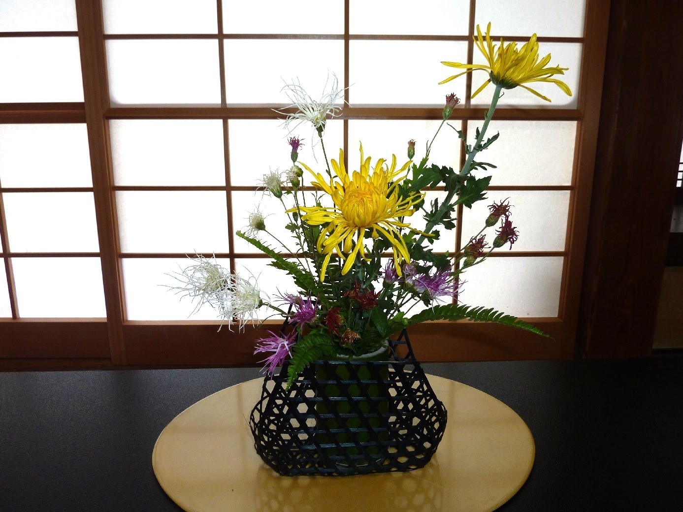 大覚寺の竹林での竹器で嵯峨菊をいける。
