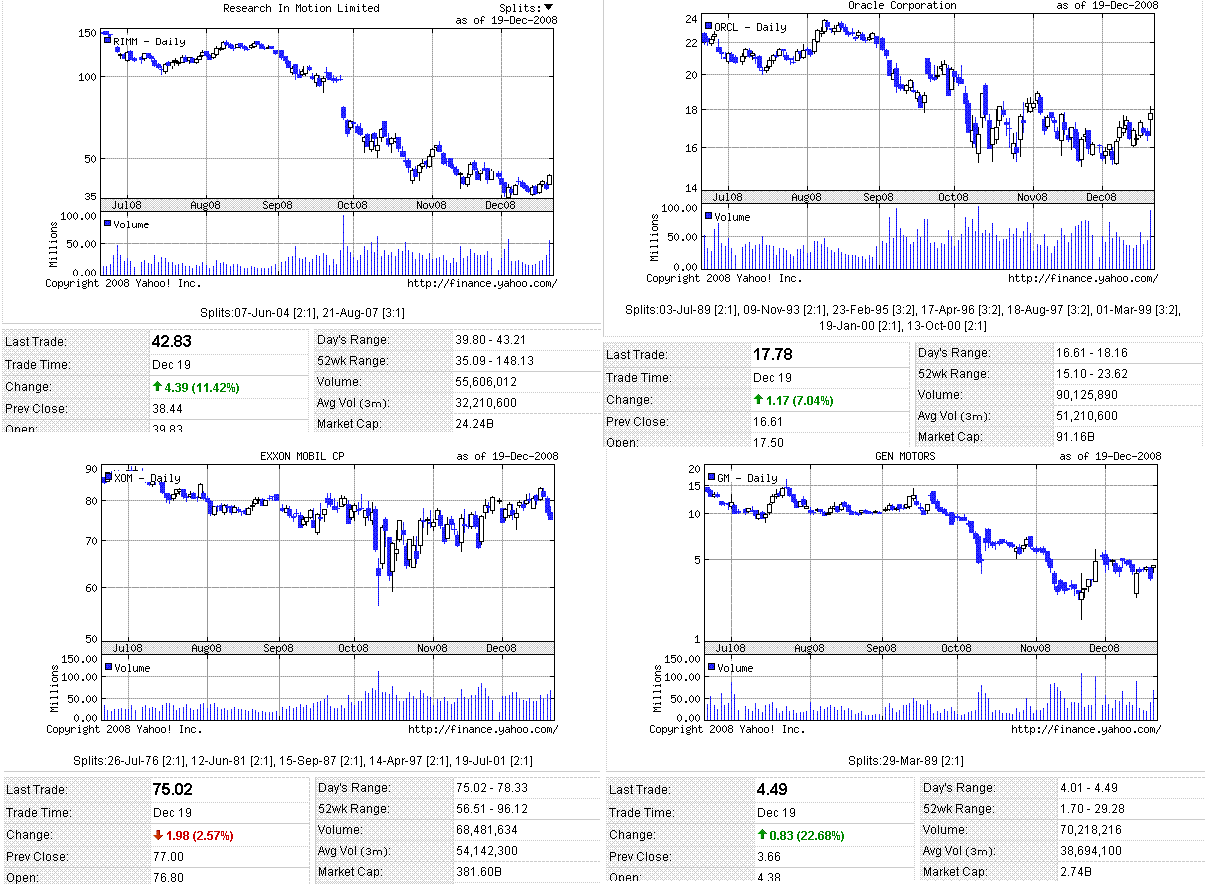 米政府による自動車メーカーへの支援が発表され寄りは高く始まりましたが、その後はずるずると下げていきました。S&Pによる格下げで金融株が売られ、原油安でエネルギー株が売られ、ダウは前日比マイナス。決算を発表したRIMとオラクルが買われたことから、ナスダック指数が相対的に強かったです。