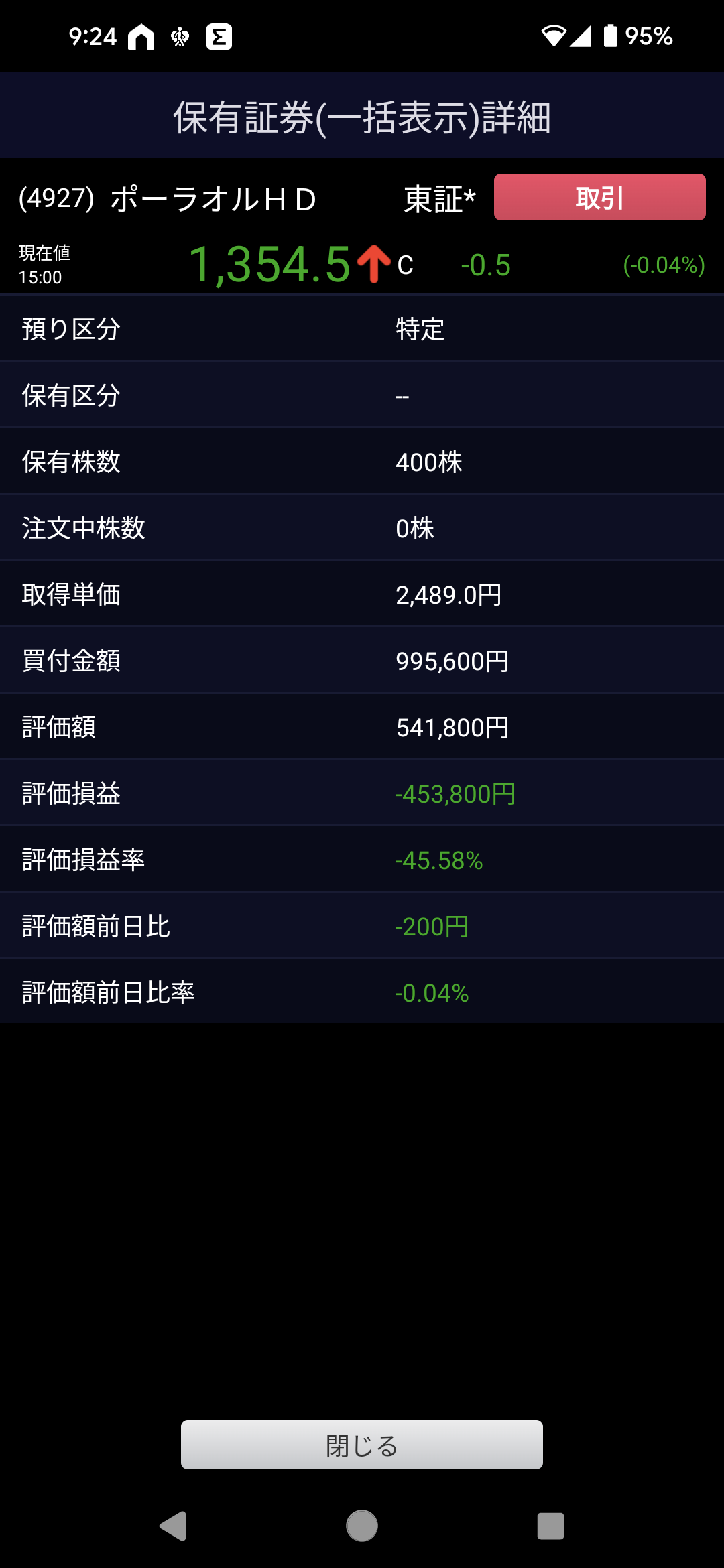 優待のdポイントは何株持っていても変わらないみたいですし、それ以上落ちても含み損は数千円程度までなので、100株程度で長期持っとくのは個人的にアリかと思います♪