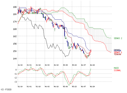 本当は、もう少し待って転換線が基準線を上回るまで待つのが正解で、安心と思うが。待てなかった。ここから落ちてもキズが浅いので。