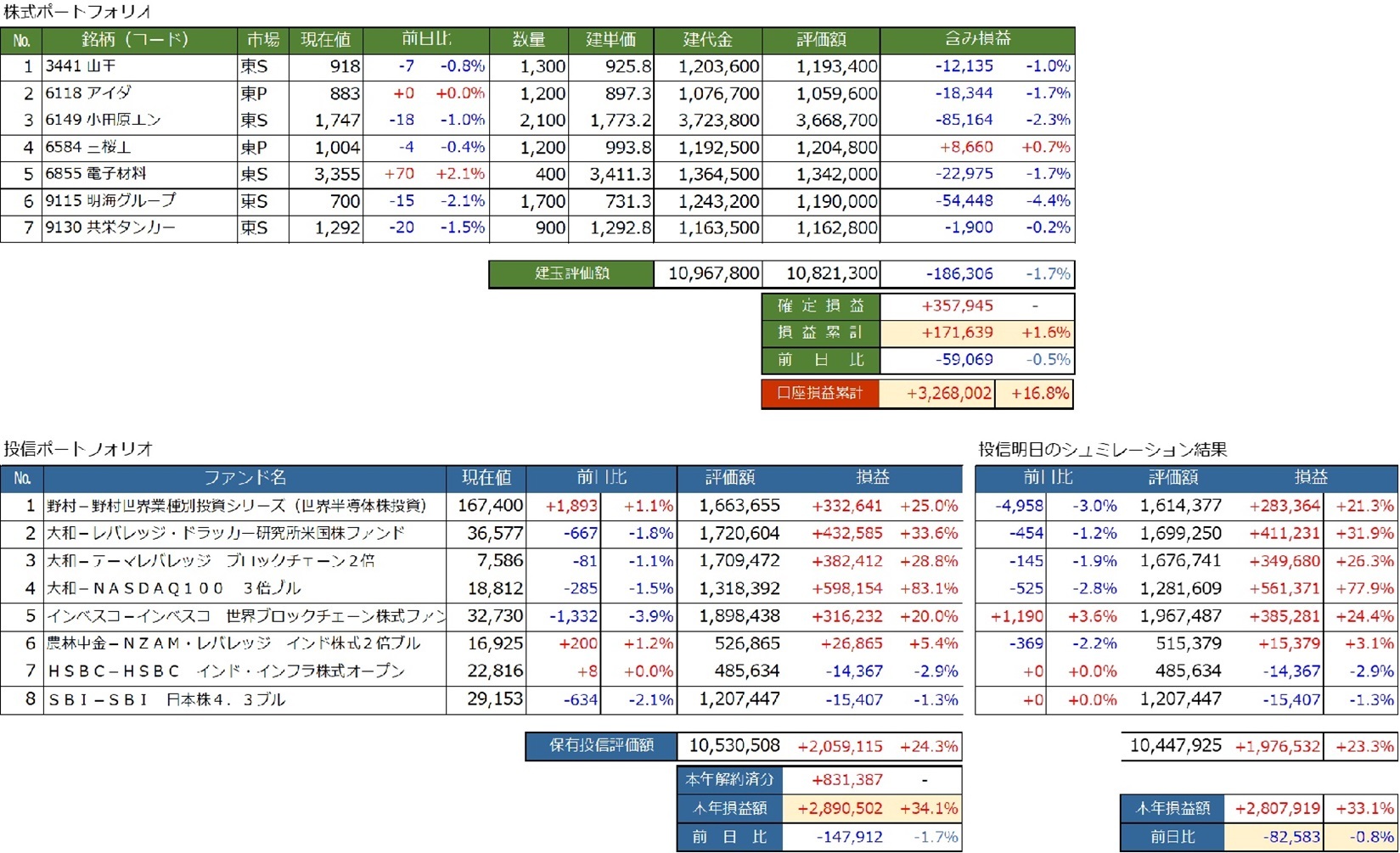 その結果、NDXが-0.93%、ビッグ5平均が-0.71%、SOX指数が-3.11%、NVDAが-2.61%、一方でトランプ氏がBTCイベント参加と伝わったことでBC関連平均が+7.14%となり、NKとインド関連を除く明日の投信は-82kと予想。
