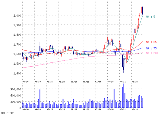 綺麗な右肩上がり。昨日下げたけど、今日上昇中。出来高もついてきてるので。