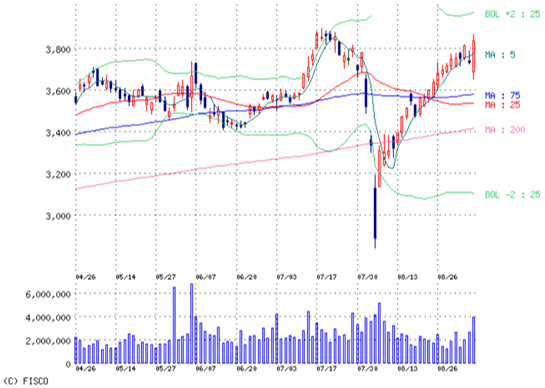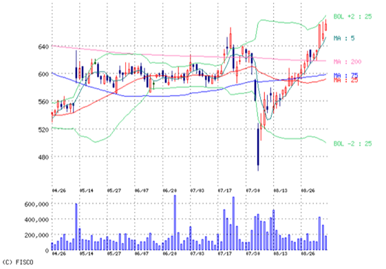 綺麗な右肩上がりですね。数日前に出来高も上がって。