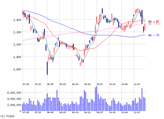 出来高急増し株価は急落し。