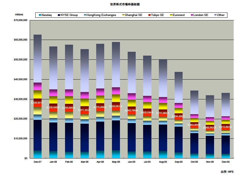2008/12の世界株式市場の時価総額は33.2兆ドル(前月比4.0%増)で2008/5以来7ヶ月ぶりに増加に転じました。