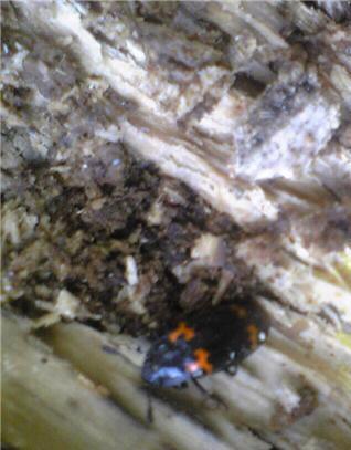寒い冬にヨツボシケシキスイも冬眠中でした。古い枯れたコナラの木にもぐりこんでいました。他にかみきりむしもコクワガタの幼虫もいました。寒いので幼虫は写真を撮らずにそっとして置きました。かみきりむしのメスがあごで木に穴を開け、其処に卵を産んで木に幼虫が穴を開けます。其処の穴から樹液が出てきて、ヨツボシケシキスイが登場です。穴をさらに大きくする役目をこの幼虫がします。其処に蜜を求めてクワガタムシやカブトムシが来ます。クワガタムシの幼虫が立ち枯れた木に入りコゲラなどの鳥たちがつついて食べます。最後の仕上げはカブトムシが落ちてきた朽木に入り土に返します。このむしも結構重要な位置にいます。カブトムシはカラスに食べられてしまいます。
