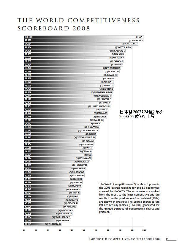 2008年の日本の順位は22位と2007年(24位)から2ランク上昇しました。かつてTOP3に名を連ねていた日本ですが、最近は停滞気味です。