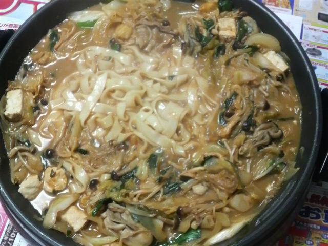 最初の状態が写真①でござる。この時点では、(いったいこれは10人前…?)と思うのでござるが、ぐつぐつと煮込んでいくと写真②の状態になりこの辺で食べ始め。ここからさらに煮込んでいくと、鉄板は浅いので段々スープが煮詰められてきて、最後は味噌風味の土手焼きのような状態(写真③)になりまする。我が家ではここできしめんを投入して、焼うどん感覚で頂きまする。