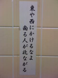 それはさておき、この一階の男子トイレにこんな標語(落書きではない)がありました。翔年は最近のトイレは清潔で何の不満もありませんが、たまにチューリップの外に小便をかける男への警告なのでしょう。