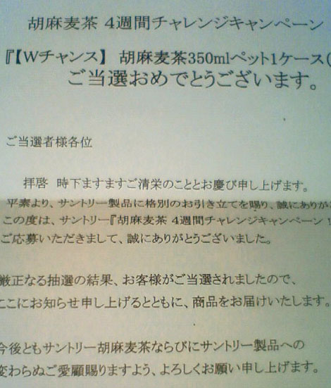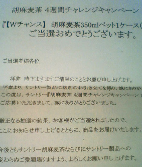ところで、一昨日家に帰ったら、サントリーの胡麻麦茶が1ケース届いていました。懸賞に応募したのも忘れていたんですが、約4000円相当が当たりました。