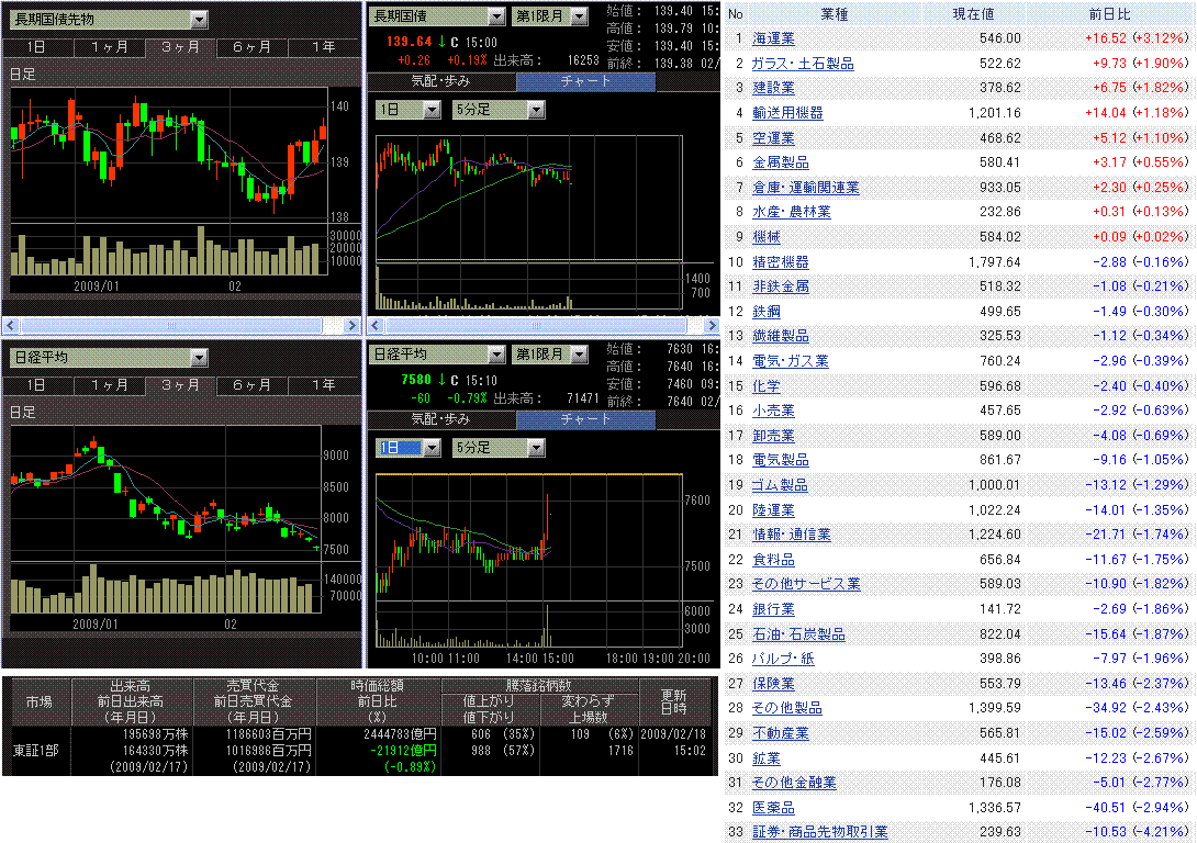 ムーディーズによる欧州新興国と西欧の銀行の財務格付けへの警告から、欧米で金融株が急落。また、再建計画を提出するGM、クライスラーの今後への不透明感もあり、米株は大幅下落となりました。オバマ大統領の署名を経て景気対策法案が成立しましたが材料視されず。なんだか、イベントの度に株式市場は大幅下落していますね。