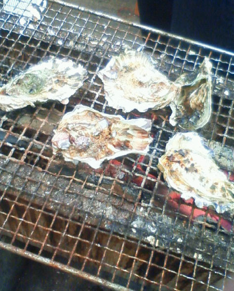 牡蠣を1キロ単位で買って、それを各々炭火で勝手に焼いてレモンと醤油で食べるんですけど、これがおいしくてメチャクチャ安いんです。牡蠣が1キロ(15個くらいかな??)600円ですよ。