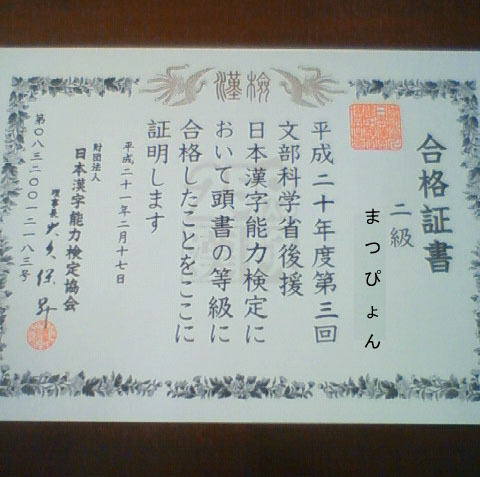 こうちゃんさんが前回お会いした時に、「まつさん、2級を一回で受かったら尊敬しますよ」ってかなりマジメに言ってました。ご本人、憶えてないだろうな~何しろ飲んだ後だったしな~(^^;