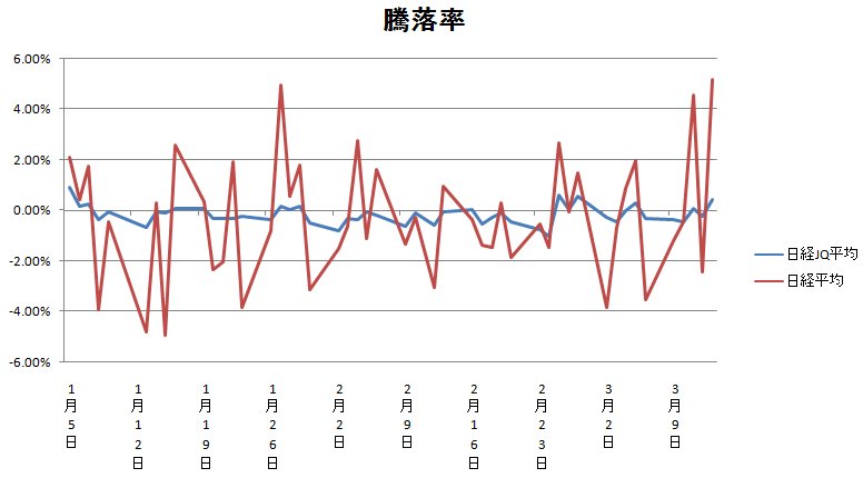 最初のグラフはジャスダックと日経平均の日々の騰落率を
