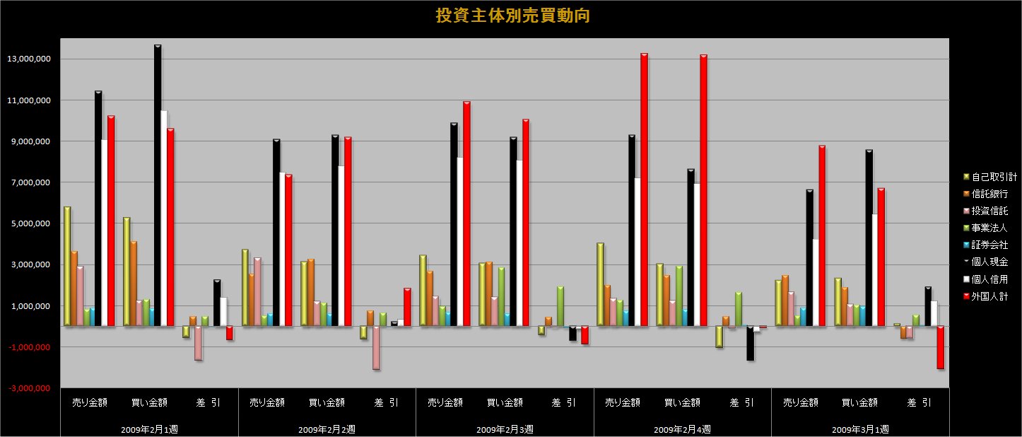 次のグラフは売買代金で見たジャスダックの投資主体別売買動向。