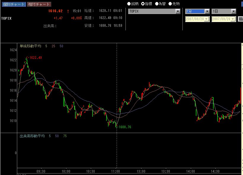 ・日経平均は小反落、TOPIXは引けのバスケット買いで小幅続伸。朝方は、NY市場の続伸と昨日からの強気継続で買いが先行しましたが、徐々に下がっていきました。昨日大幅高していた、不動産、保険、銀行、証券などは全体的には弱かったです。やっぱり、ヘッジファンドの買戻しだったんですかね。TOPIXの引けのバスケット買いはドレッシングっぽいですね。機関投資家が大量に持っているトヨタが終日強くて引けに大きな買いが入ってました(6月末も同様の動きをしていました)。