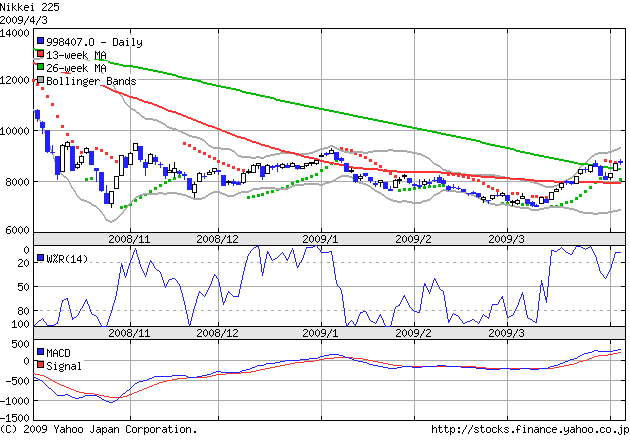 日経平均のチャートも見方によってはしばらく上昇しそうです。ボリンジャーバンドを見ると大きく広がり、11月までの下落の時の反対の長期トレンドが出ているようにも見えます。人によっては5月の連休前後に1万円行きそうと言い出しました。世界で500兆円の財政出動が効いて来るでしょう。24日にはG7が開かれ今回のG20の確認をするみたいです。