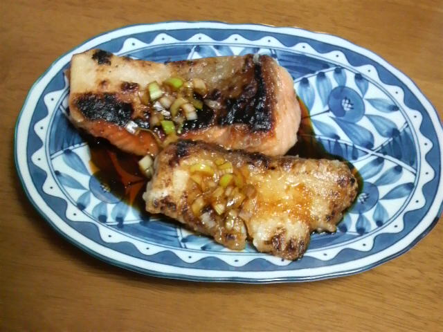 今週は一応新作料理と申しましょうか、今まで拙者が勘違いして既に掲載したと勝手に思いこんでいた初登場料理、『鮭とタラのムニエルねぎソース』でござる。