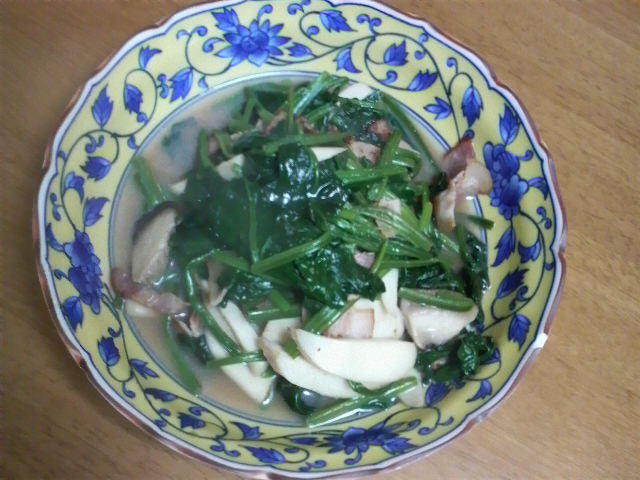 ほうれん草ソテーの方は、一旦ほうれん草をゆがいてからベーコン、エリンギと炒めるも、ちょっと時間が足りず水っぽくなってしまい申した。今度はもう少し上手く作りたいと存じまする(^^;