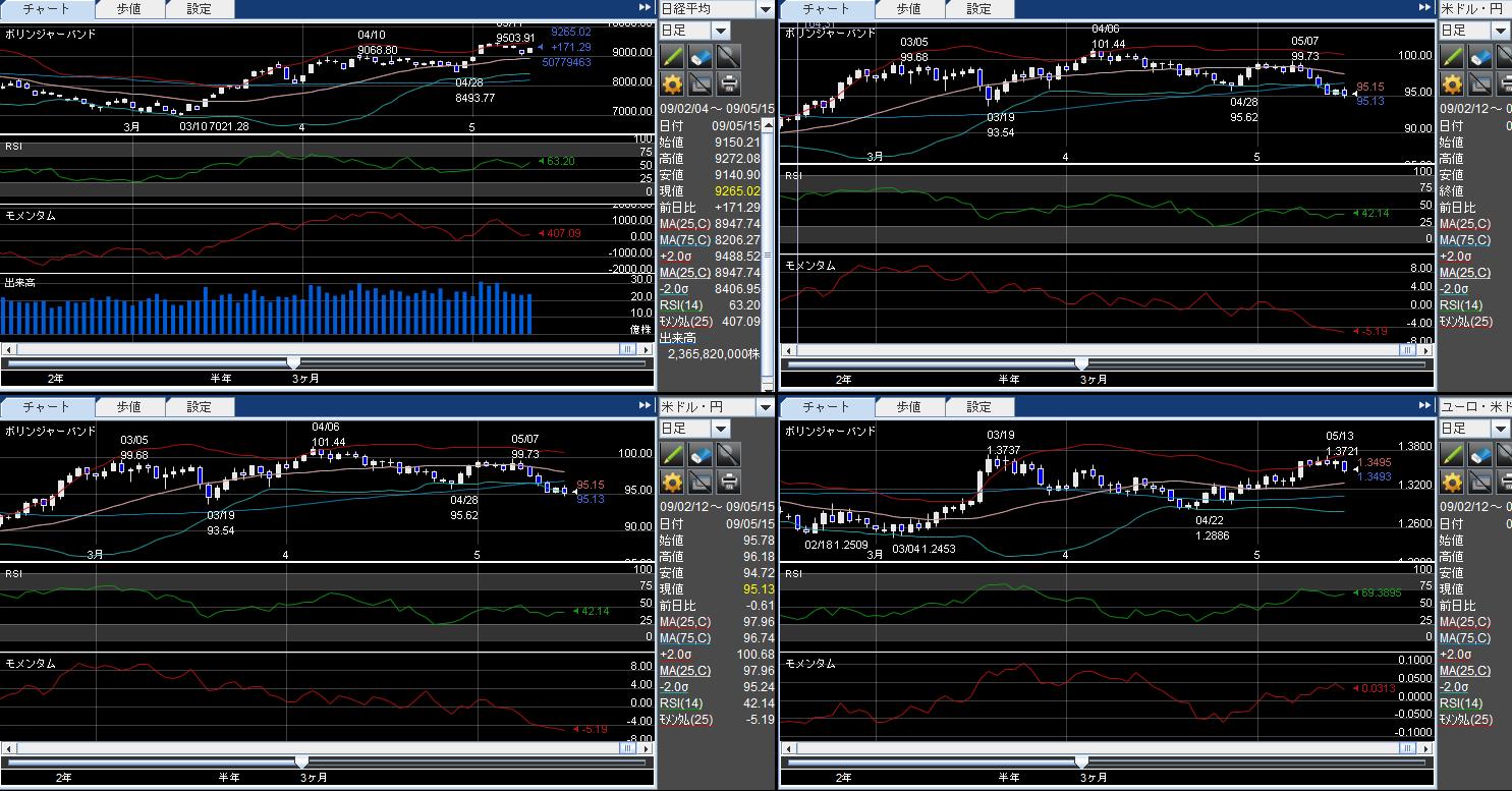 図1:日経平均(左上)/㌦円(左上)/ユーロ円(左下)/ユーロ㌦(左下)