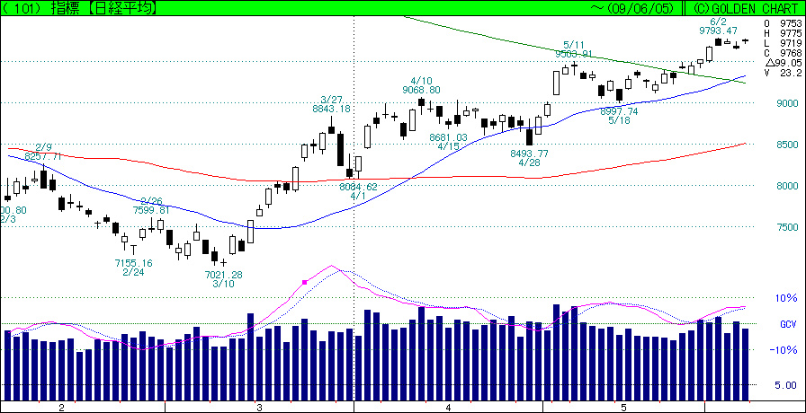 明日の拙者ポジションは、¥9,800台で上値が重くなるようなら一部利確。それ以外は様子見で参りたいと存じまする。