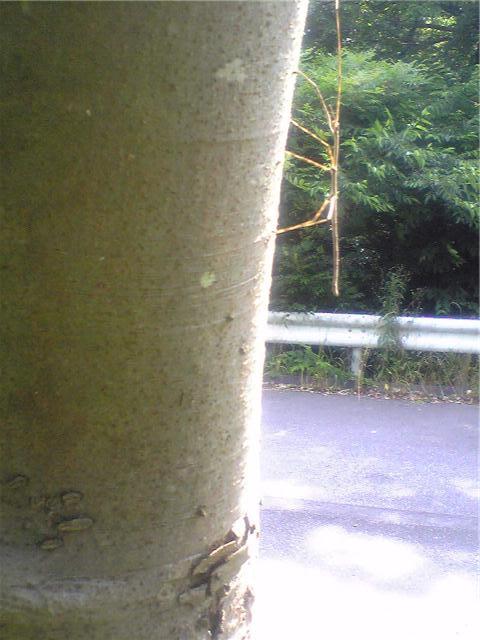 擬態 , ナナフシ , どこにいるかな :同じ木を縦と横から撮影も、2.はどこにいるか全くわかりません。ナナフシの大きな体が木の枝にみえてしまいます。1.でもよく見ないとわかりません。擬態の天才です。