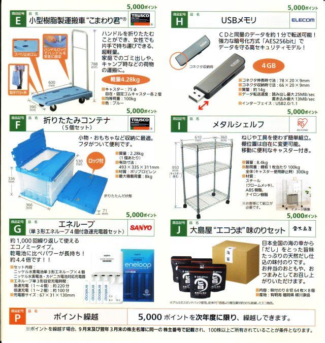 写真右に10000ポイントの商品が掲載されていますが、100株(5000ポイント)しかない場合も今回のポイントを繰越、次回のポイントと合算する事で次回10000ポイントの商品と交換と言う事もできる様になりました。