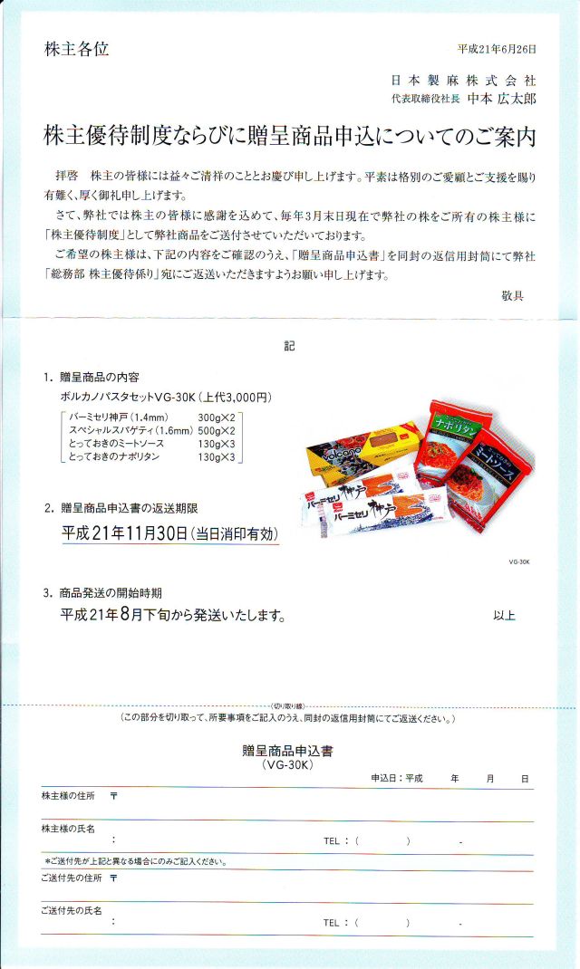 本日(3306)日本製麻の株主優待(申込書)が到着しました。