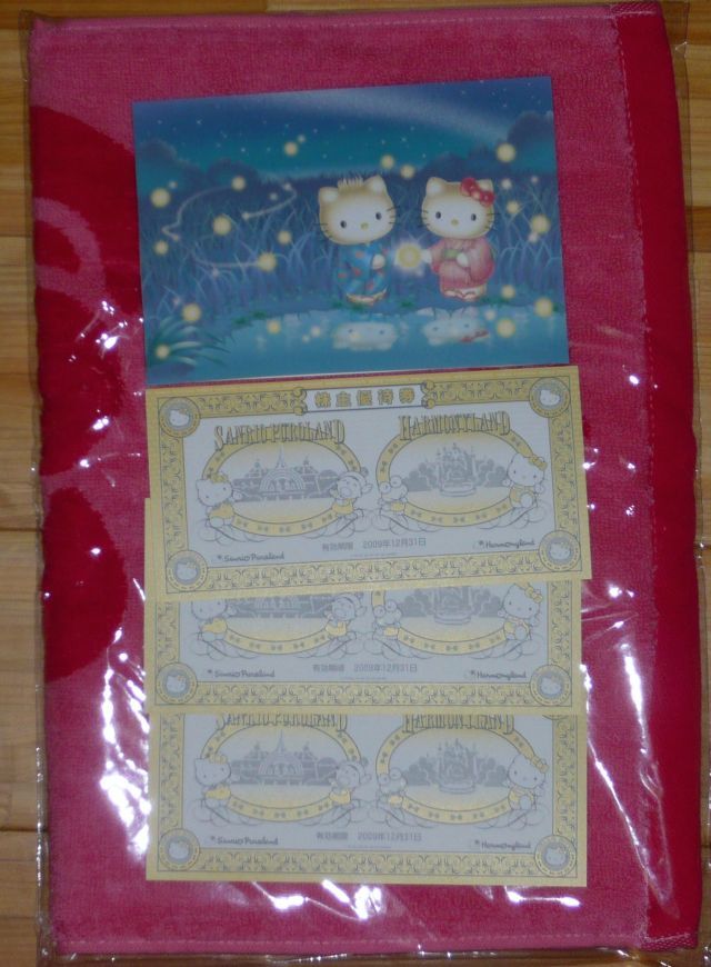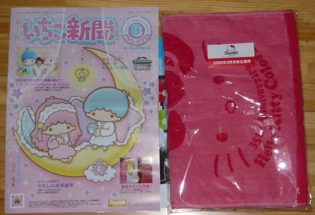 写真は『ハローキティ35周年記念デザインのジャカード織りスポーツタオル』『いちご新聞』『自社施設優待券』で