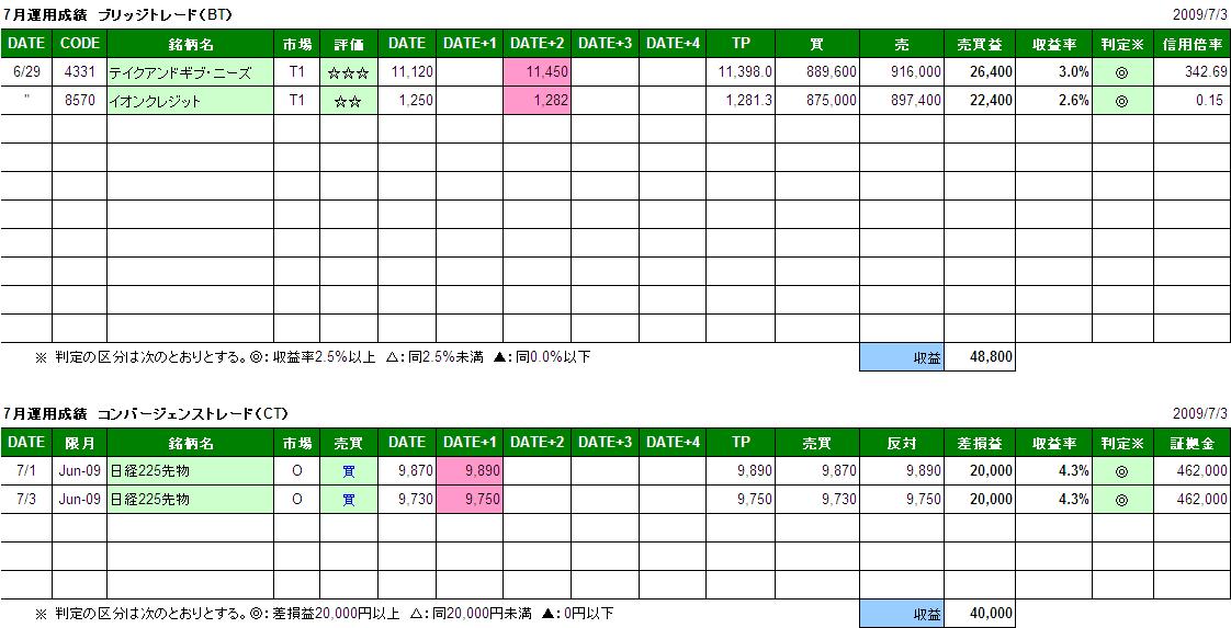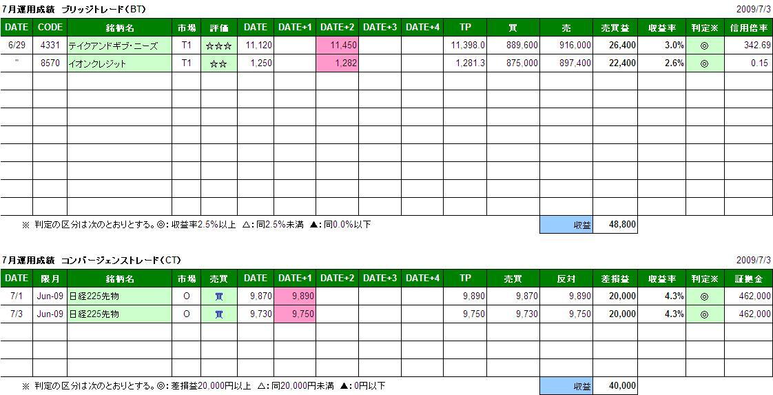 7月第1週はブリッジトレード(株式取引)およびコンバージェンストレード(日経225先物取引)ともに100%という最も高いパフォーマンスをあげることができました。
