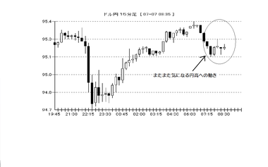 気になる対ドル円レートがまたまた円高に動いています。15分足でみるとかなり目立つ動きなので十分ご注意願います。基本は強気ながら、慎重な姿勢で臨みたいと思います。