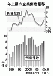民間調査会社の東京商工リサーチが8日発表した2009年1-6月期の企業倒産は、前年同期と比べ件数・負債総額ともに増加した。負債総額1000万円以上の企業倒産(銀行取引停止処分などを含む)件数は前年同期比8.3%増の8169件で、上半期としては03年(8786件)以来、6年ぶりに8000件を上回った。 負債総額は47.4%増の4兆6853億円と、04年(4兆1642億円)以来、5年ぶりに4兆円を超えた。負債が100億円以上の大型倒産が70件と、前年同期の42件を大幅に上回ったことが響いた。ただ08年下半期(7-12月)の9兆円超よりは減少した。 上場企業倒産(上場廃止後の倒産を除く)は18件だった。 業種別では最も多い建設業の倒産件数が1%減った。これに対して製造業は31%、不動産業は25%増えた。
