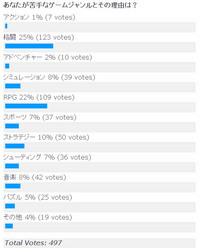 編集元:ニュース速報板より「苦手なゲームジャンル、格ゲーとRPGがぶっちぎりの1・2位」1 スカシタゴボウ(福岡県) :2009/05/16(土) 15:20:59.96 ID:kIRnAhev ?PLT(12101) ポイント特典Game*Sparkリサーチ『あなたが苦手なゲームジャンルとその理由は?』結果発表 毎週恒例の読者参加型アンケートコーナー『Game*Sparkリサーチ』。「あなたが苦手なゲームジャンルとその理由は?」というお題で皆様から集まった投票結果をご報告。 結果を見てみると"格闘"および"RPG"が苦手と言う方が圧倒的に多いようです。苦手な理由として"格闘"は「力の差が出易い」「コマンドが入力出来ない」、"RPG"は「時間がかかる」「レベル上げが面倒」といった意見が挙げられています。 さてその他のジャンルはどのような苦手な理由が挙げられているのでしょうか。読者の皆様から寄せられたコメントを幾つかご紹介します。続きはソースでhttp://gs.inside-games.jp/news/187/18782.html
