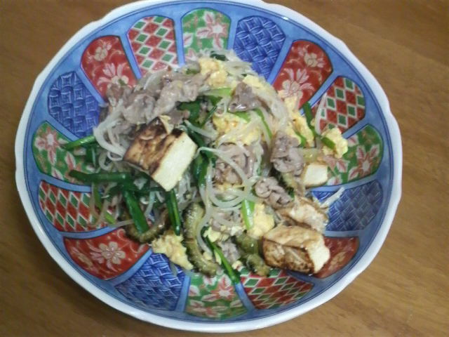 6. 豆腐、ゴーヤ、卵、素麺を加え、塩、こしょう、鶏がらスープの素で味付けて出来上がりでござる。