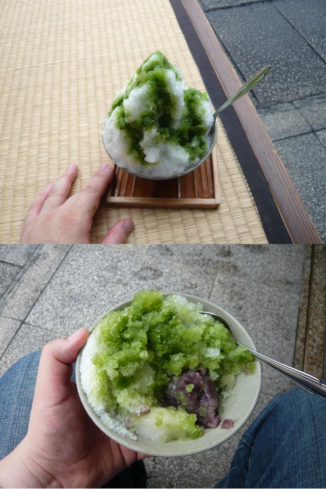 写真中央がそれですが、赤福のお餅と餡子が別々に抹茶氷の下に入っているんですが、物が赤福だけに普通の抹茶あずきに比べて餡子も上品な甘さで美味しいしお持ちも硬すぎず柔らか過ぎずで美味しかったです(^^)